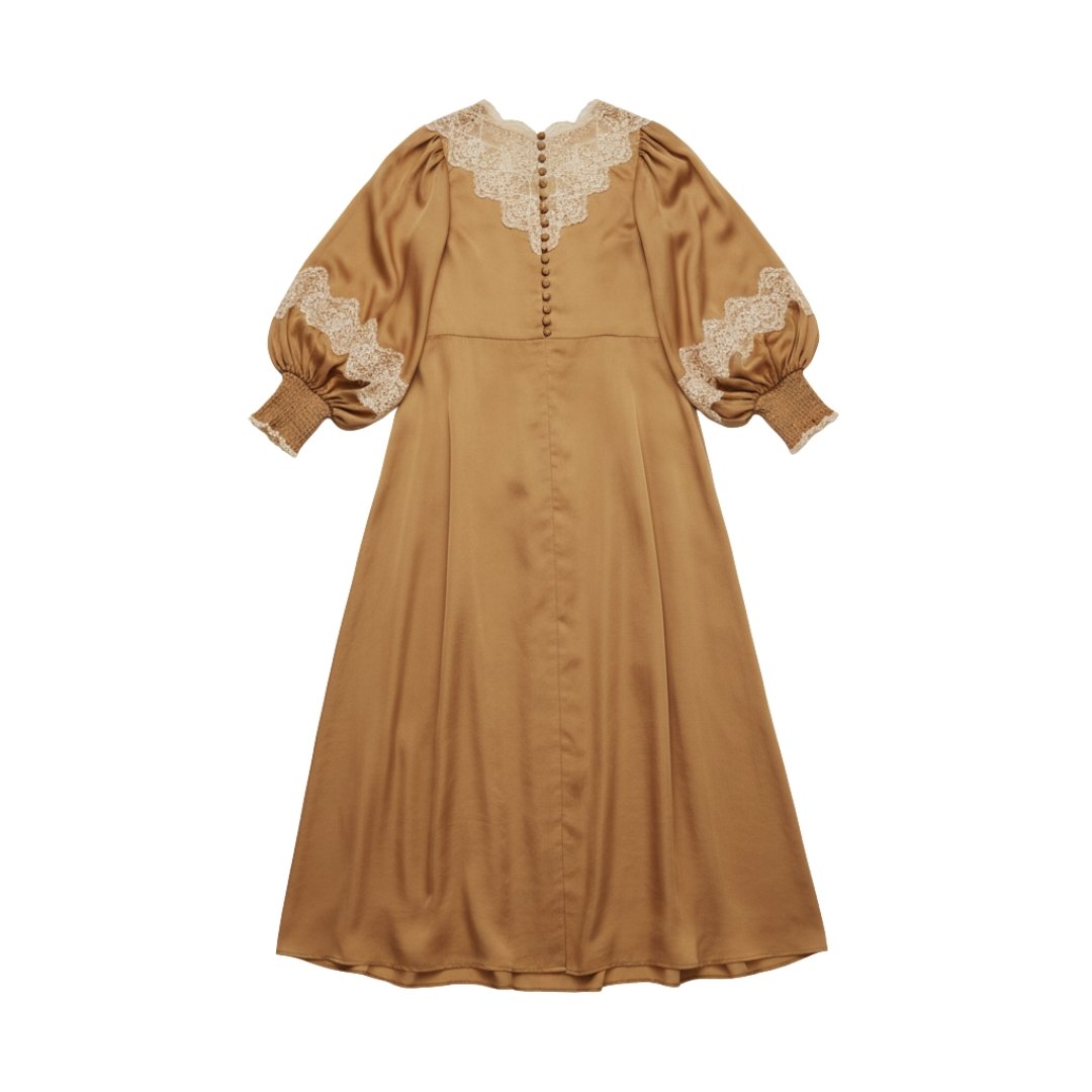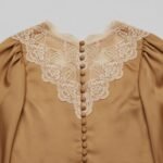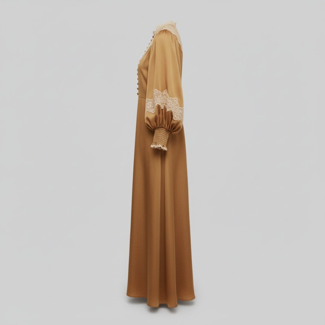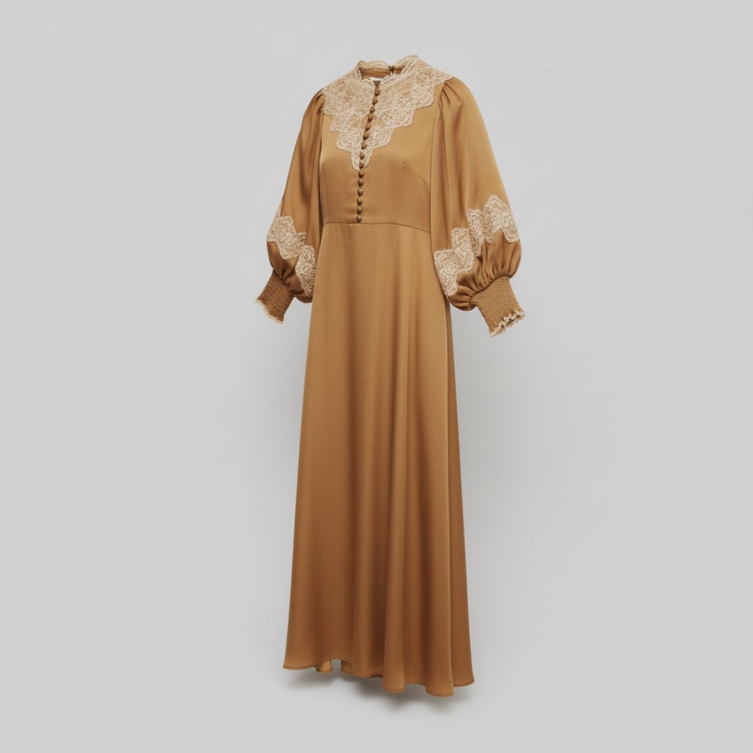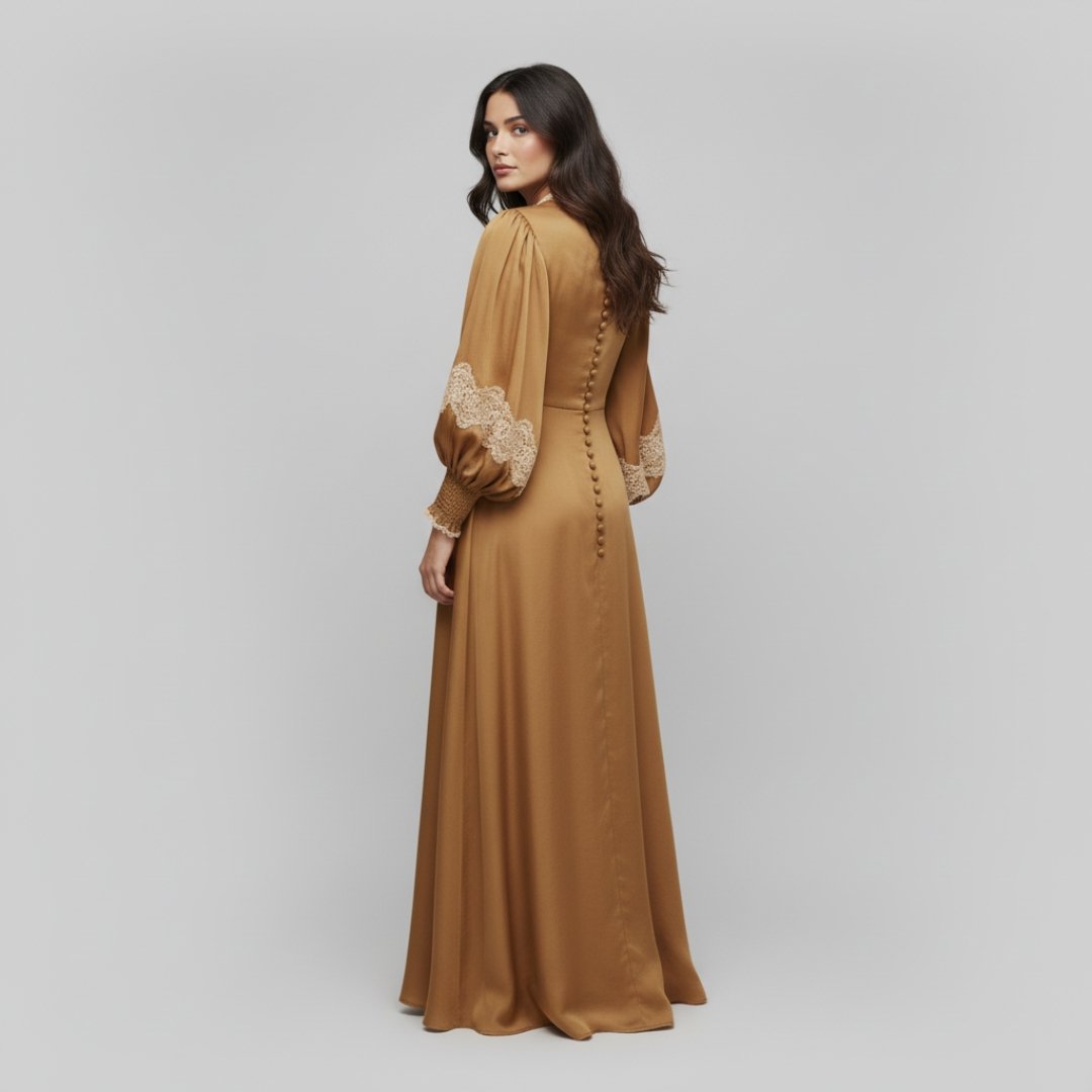 Su textura ligeramente granulada y su caída densa envuelven el cuerpo con movimiento majestuoso, mientras el encaje en el escote y los puños añade un toque poético.