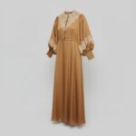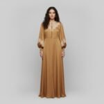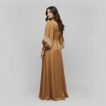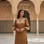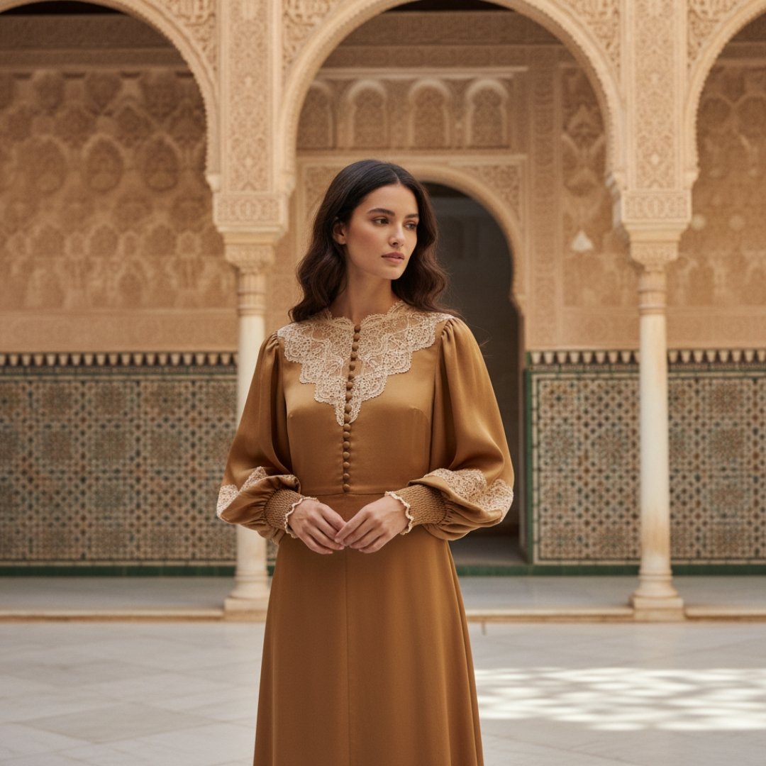 Las mangas globo evocan la opulencia del arte andalusí, mientras los botones forrados a lo largo de la espalda simbolizan la atención al detalle y la tradición de la alta costura.