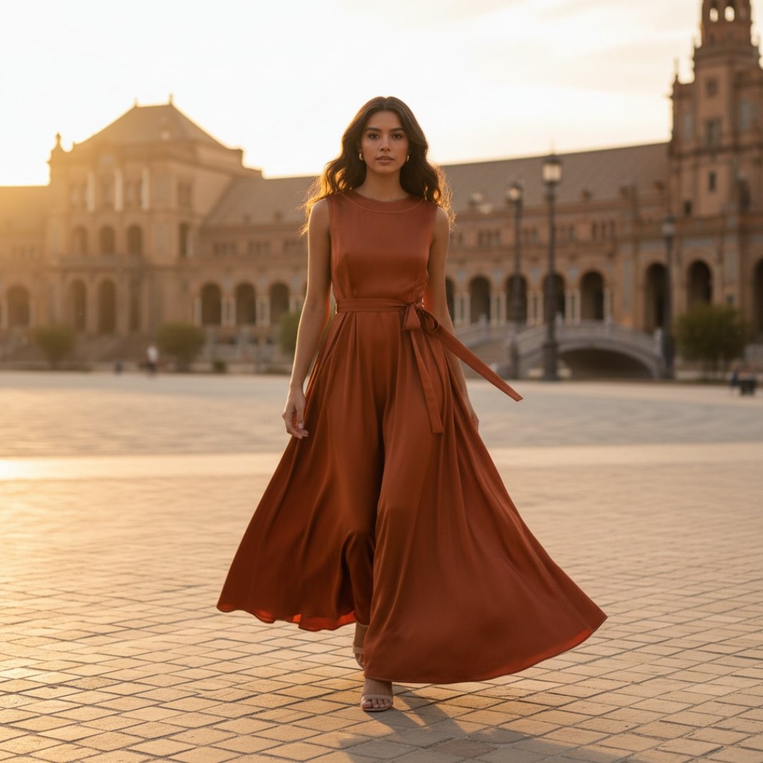 Imagina la hora dorada en Sevilla, el aire templado y suave acariciando la piel mientras te mueves con gracia en el Andalusian Sunset Gown.