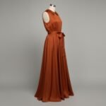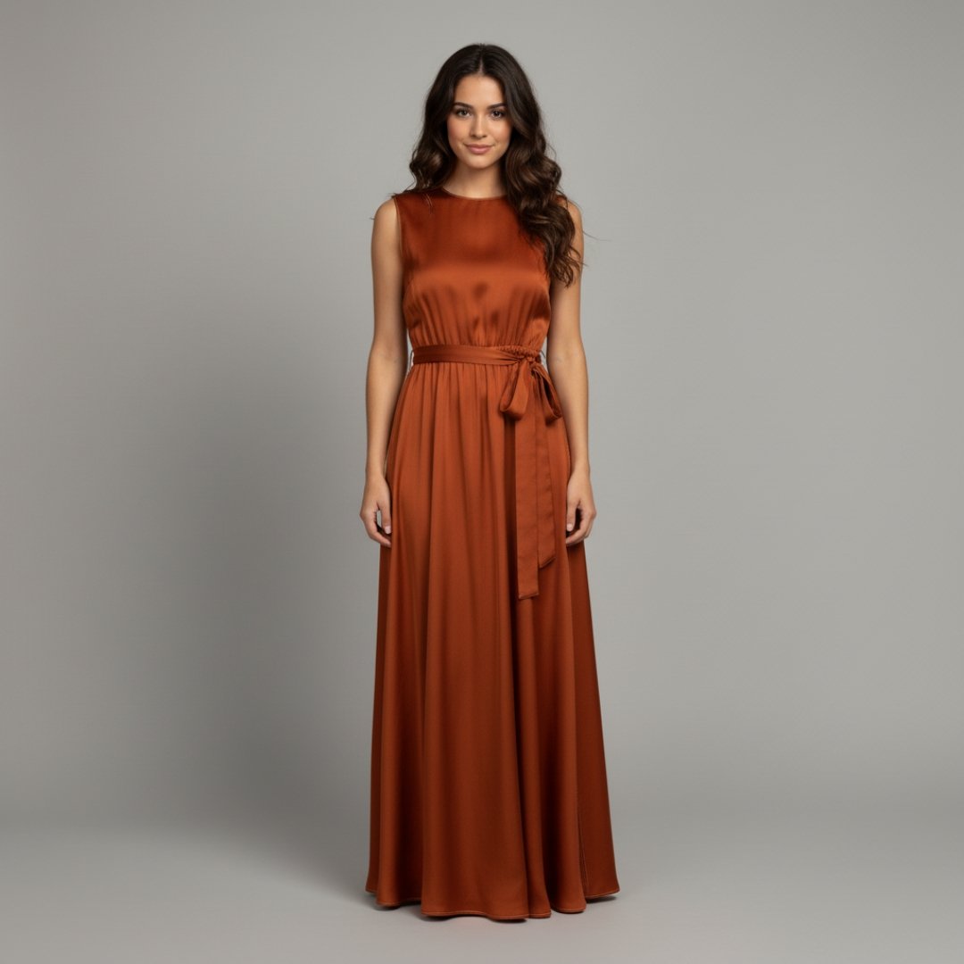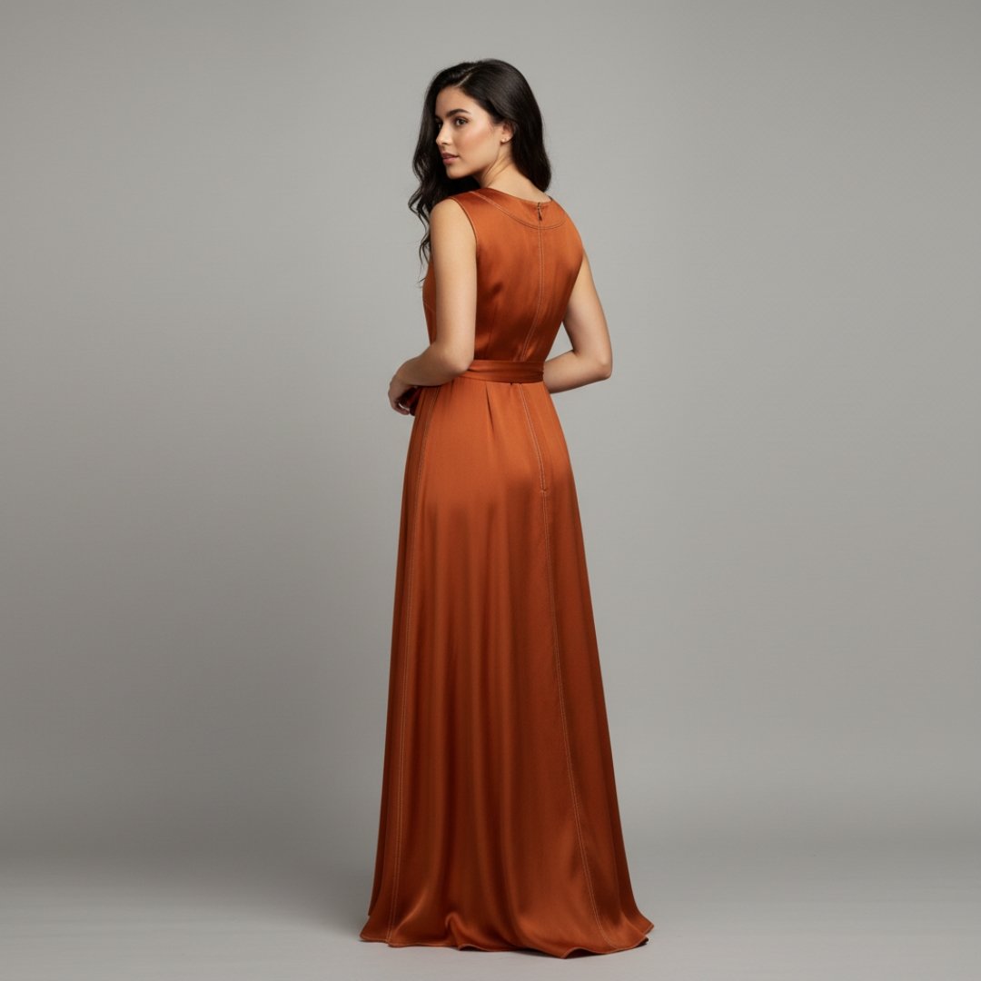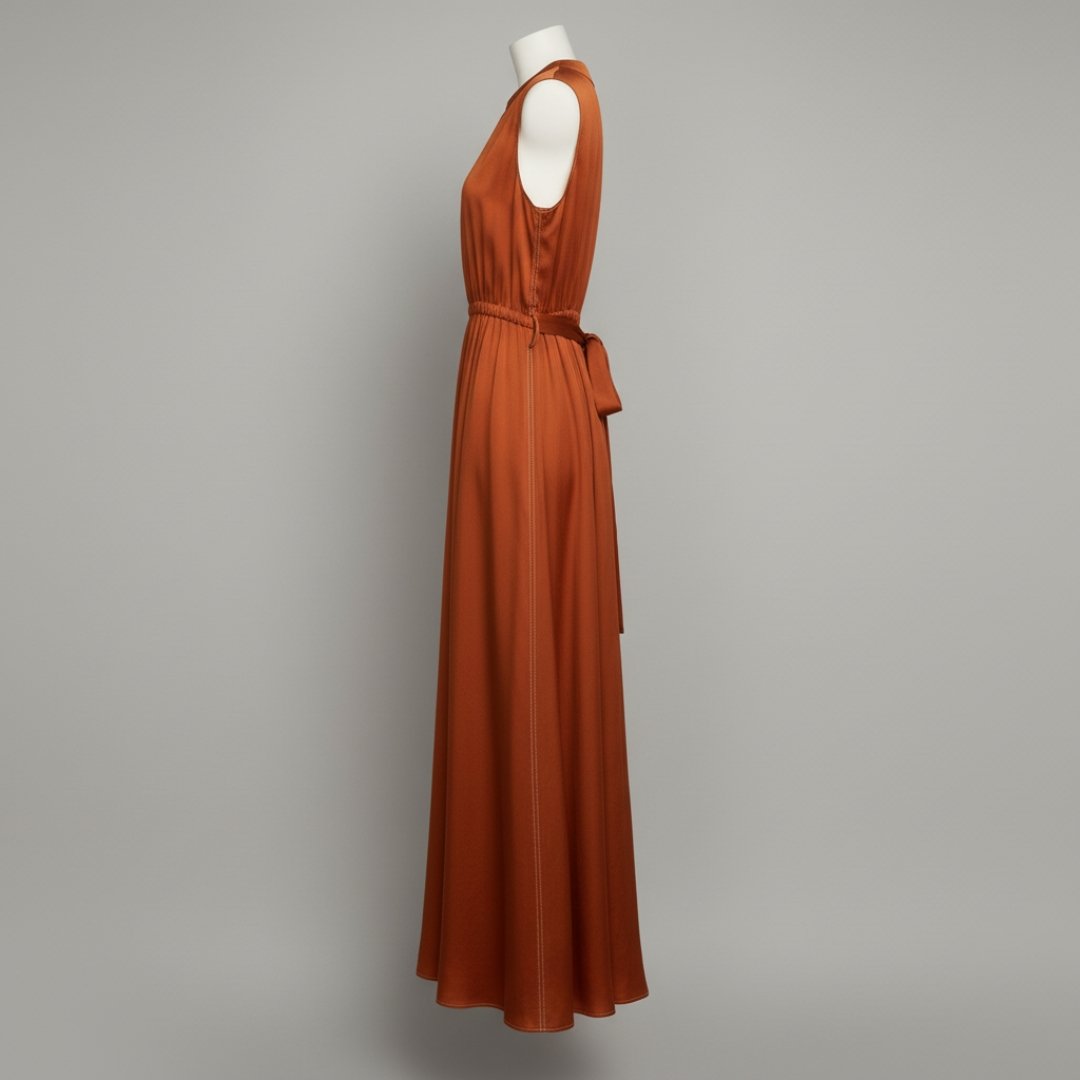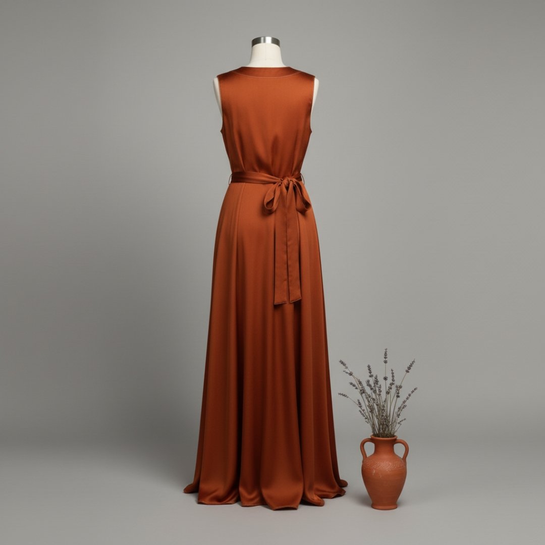 El Andalusian Sunset Gown ha sido confeccionado con seda Habotai, una fibra natural reconocida por su suavidad y su capacidad para captar la luz con sutileza.