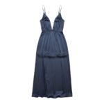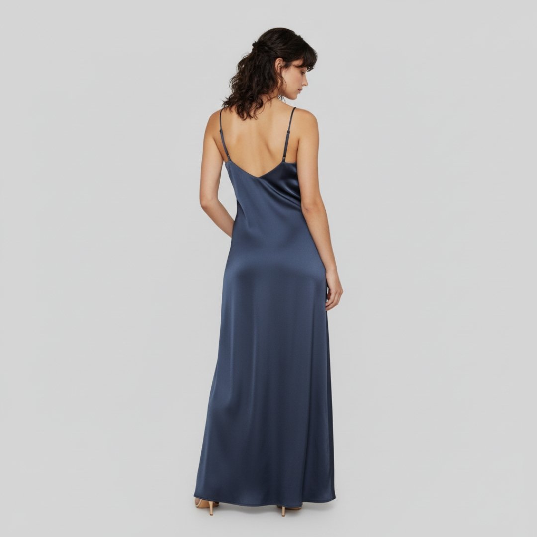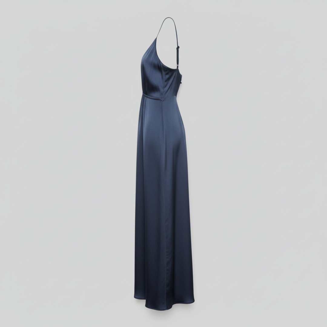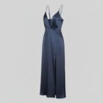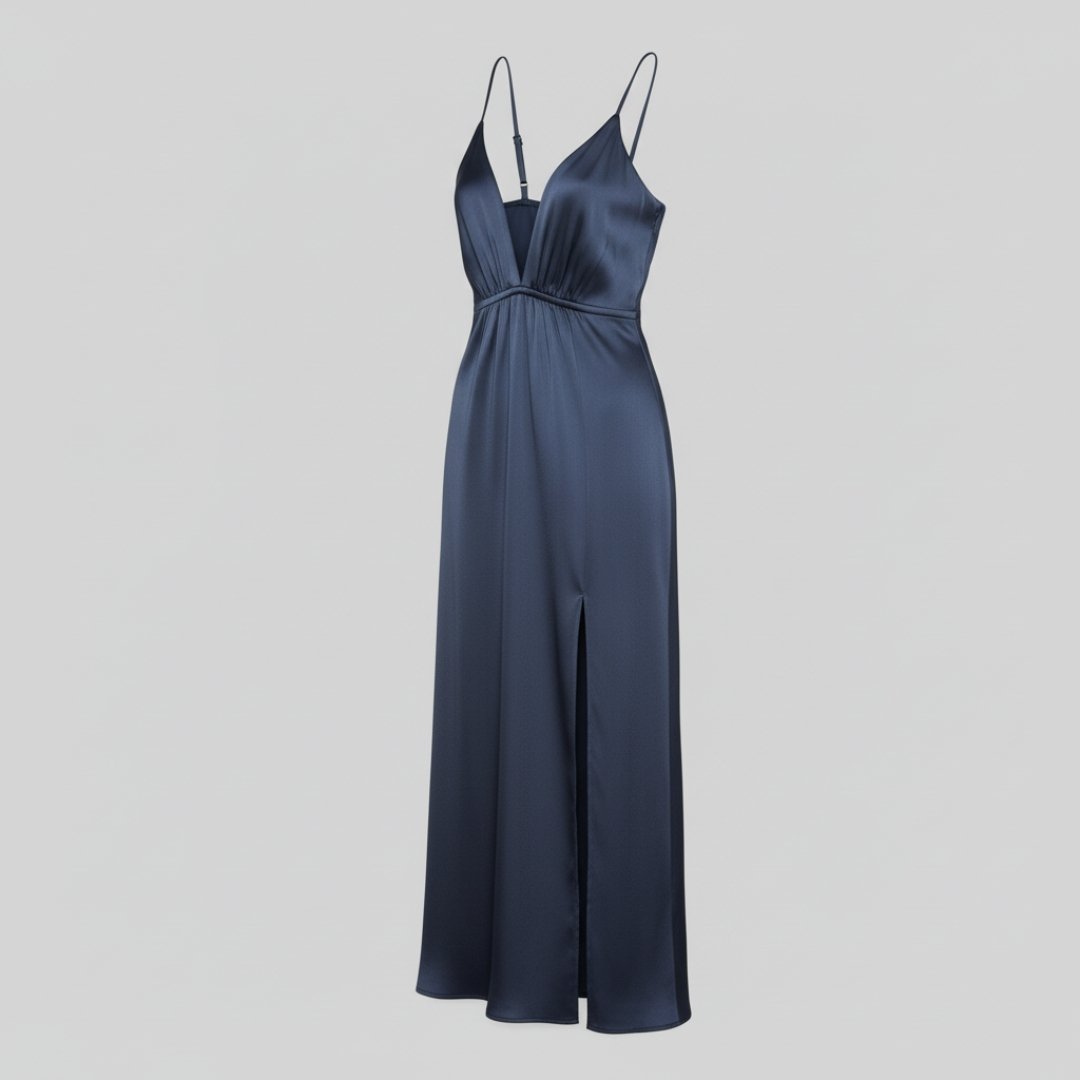 El escote profundo y la abertura lateral crean una silueta que equilibra romance y modernidad, perfecta para celebraciones nocturnas o momentos íntimos.